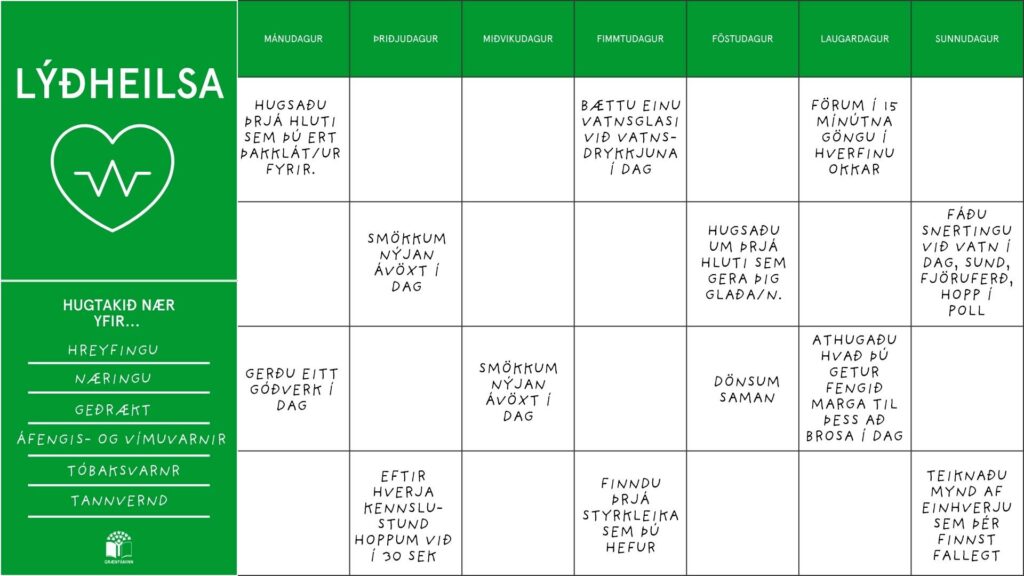 Dagatal sem ýtir undir heilbrigði og velferð sem er undirstaða lýðheilsu. Hægt að leyfa nemendum að bæta við í auða reiti. Hentar öllum aldri